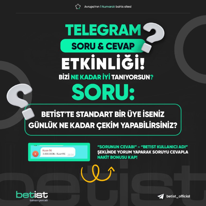 TELEGRAM SORU CEVAP ETKİNLİĞİ HOŞGELDİNİZ DOĞRU CEVABI YAZIP EMOJİ BIRAKAN İLK 150 KİŞİYE 100 FREESPIN HEDİYE! SORU: BETİST'TE STANDART BİR ÜYE İSENİZ GÜNLÜK NE KADAR ÇEKİM YAPABİLİRSİNİZ UNUTMA VERDİĞİN CEVABIN YANINA KULLANICI ADINI'DA YAZMALISIN KURALLAR; TELEGRAM Kanalımızı TAKİP ET , Emoji Bırak ve Doğru Cevabı YORUM YAP . Bakiyenizi 3000₺ Yapıp 250₺ Yatırım yapıp 500₺ Çekim verebilirsiniz. BETİST GÜNCEL GİRİŞ