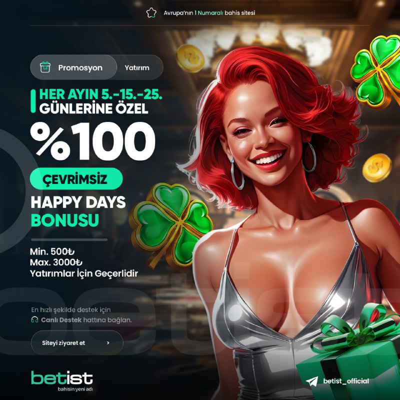 BETİST İLE MUTLU KAZANÇLAR ÇEVRİMSİZ TAM %100 HAPPY DAYS BONUSU Min 500₺ Max 3000₺ Yatırımınıza Özel %100 Bonus Her Ayın 5 - 15 - 25 Günlerinde Geçerlidir ! KAZANMAYI SEVENLERİN ORTAK NOKTASI BETİST ! Tüm Detaylar Canlı Destek Hattımızda ! BETİST GÜNCEL GİRİŞ