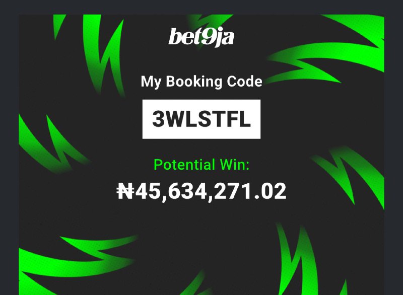 Bet9ja code : 45 odd: https://sports.bet9ja.com/?bookABetCode=3WF69XC 10 odd: https://sports.bet9ja.com/?bookABetCode=3WF832Z 5 odd: https://sports.bet9ja.com/?bookABetCode=3WF7572 2 odd: https://sports.bet9ja.com/?bookABetCode=3WF8CVP