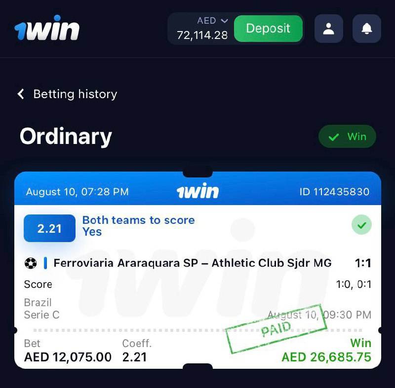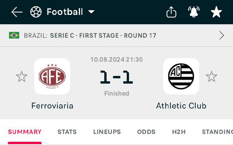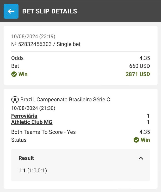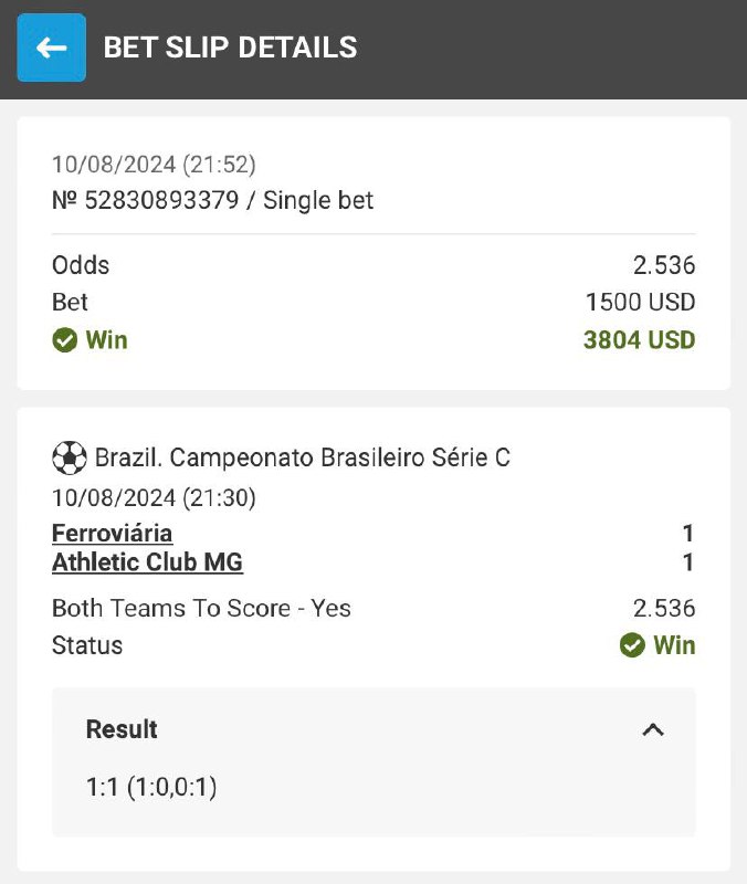 Goal from Ferroviaria was scored in 21 minutes, goal from Athletic Club in 88 minutes, job on BTTS - YES done with high odds in live