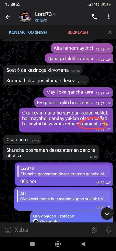 Qalesila Azartnikla Tuzukmisila Xullas 5 6 kun oldin ogoxlantirib qoygandim silarni moshenik chiqgan Lord73 kanali adminiman deb potpischiklarni aldab yurgandi.Bitta shustriy potpischigim iq+999 Ekan Qanaqadur sayt bor ekan osha saytni ustiga bosa rasmga tushirib olarkan U Miyyasi yoq yetim oʻsha ssilkani ustiga bosibdi Mana Rasmga tushirib olibdi Korvolila TROL NI Maxluqlar Qiroli Basharani qarela Yetimmi bolas Oʻzi bilmay kotini ochvordi kimgadur shu yozsa Lord73 kanali nomidan shu rasmni tashab azoblila