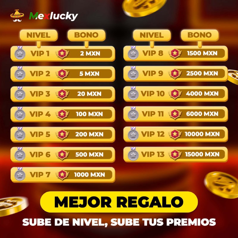 ¡Regalo de Ascenso VIP – Un privilegio para quienes lo merecen!¿Acabas de subir de nivel? ¡Mexlucky no te deja con las manos vacías! El bono de ascenso VIP es un regalo exclusivo solo para ti. ¡Con cada nuevo nivel VIP, recibe una recompensa única!