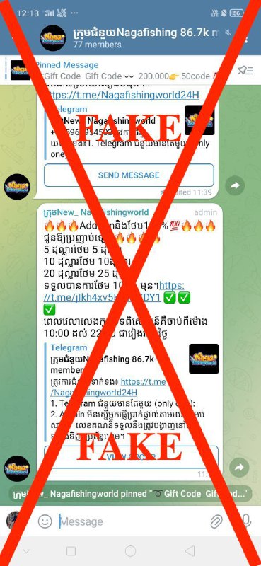ថ្មីៗនេះ យើងខ្ញុំបានសង្កេតឃើញថា មានជនខិលខូចបានប្រើបណ្ដាញសង្គមដោយមានឈ្មោះ Telegram Naga fishing world យើងខ្ញុំដើម្បីទាញយកផលប្រយោជន៍ផ្ទាល់ខ្លួនឆបោកបងប្អូនទាំងអស់គ្នា!