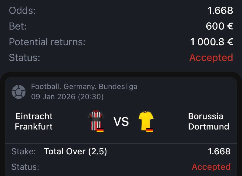 FREE BET OF THE DAY Eintracht Frankfurt vs. Borussia Dortmund 4 of the last 5 head-to-head matches played in Frankfurt finished with over 2.5 goals. Both teams play attacking football and regularly create chances.