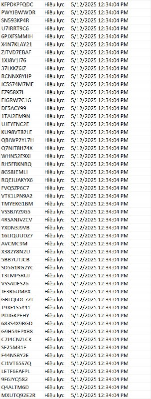 Tổng cộng 1000 mã 20 Bảng, mỗi bảng 50 mã code